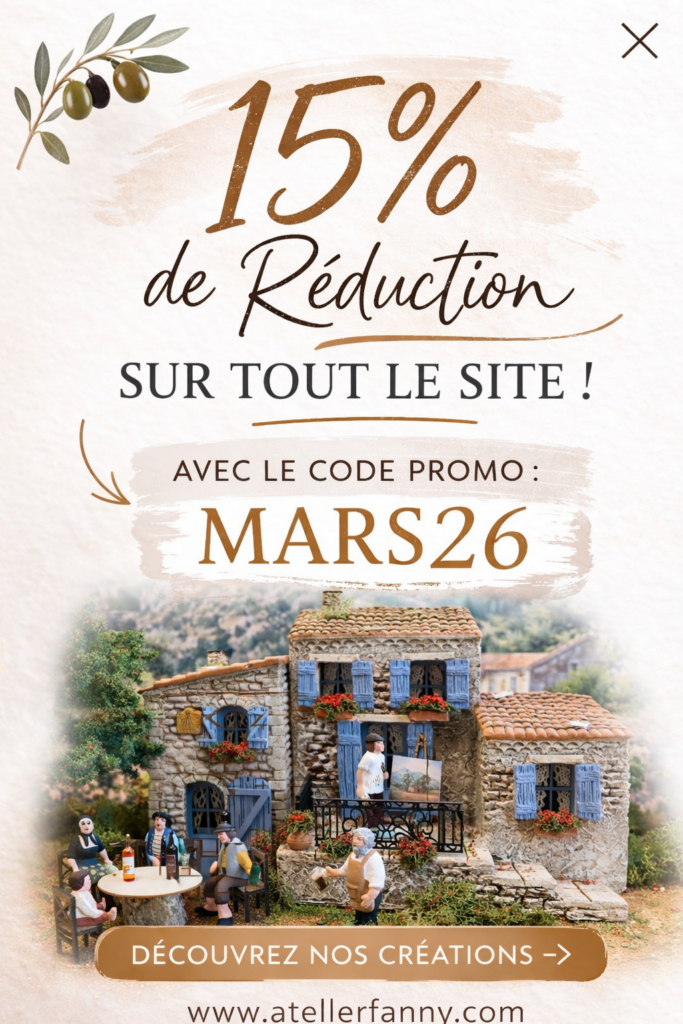 À L’Atelier de Fanny, chaque décor de crèche et santon de Provence est fabriqué artisanalement dans notre atelier familial à Aubagne. Nos créations, façonnées à la main avec passion, reflètent un savoir-faire traditionnel transmis de génération en génération, garantissant authenticité et qualité pour vos fêtes de Noël.